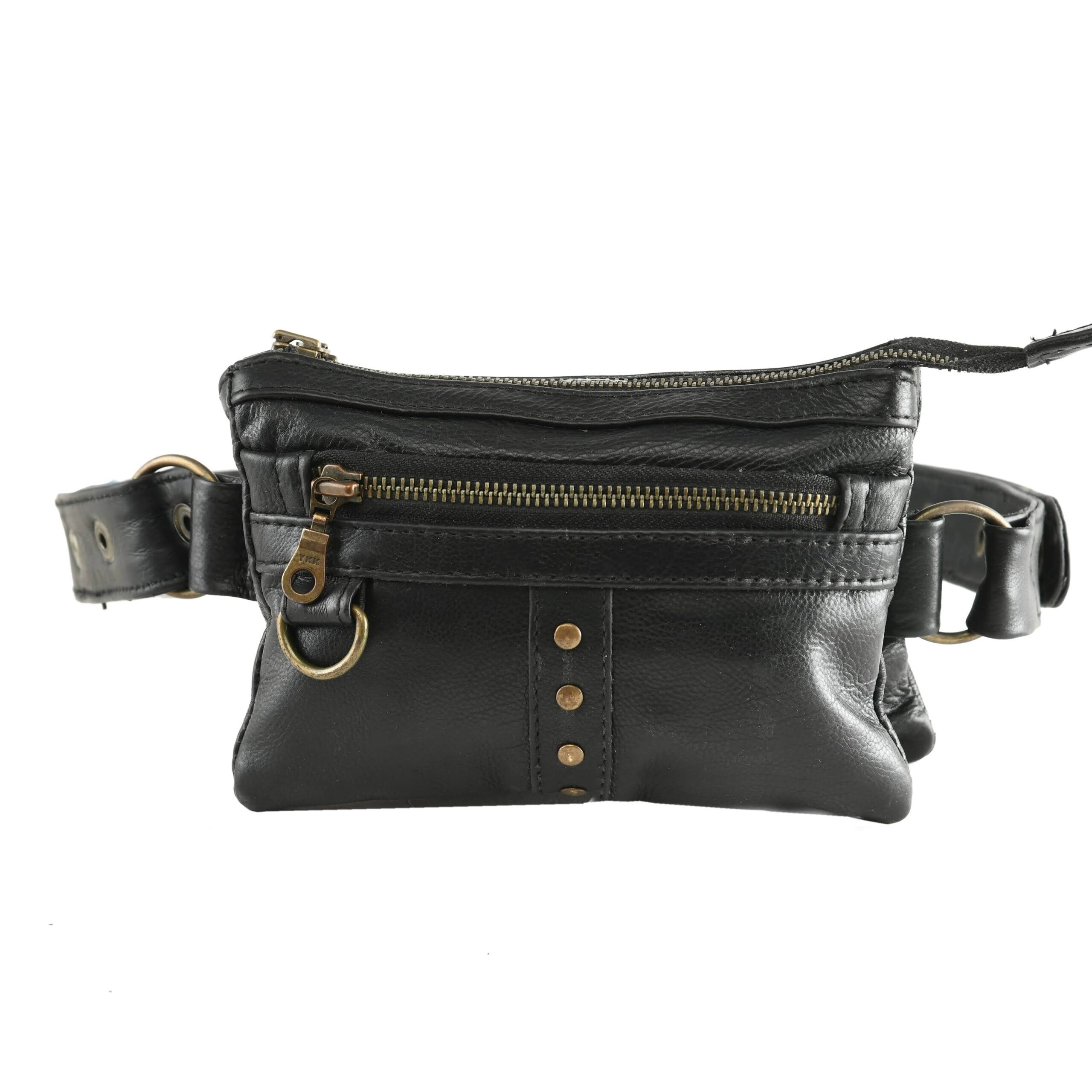 Black Leather Waist Pouch with Antique Brass Rivets – Hands-Free Everyday Utility