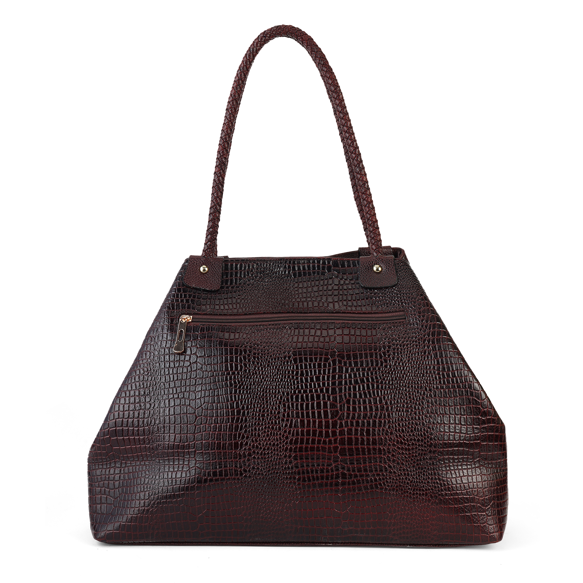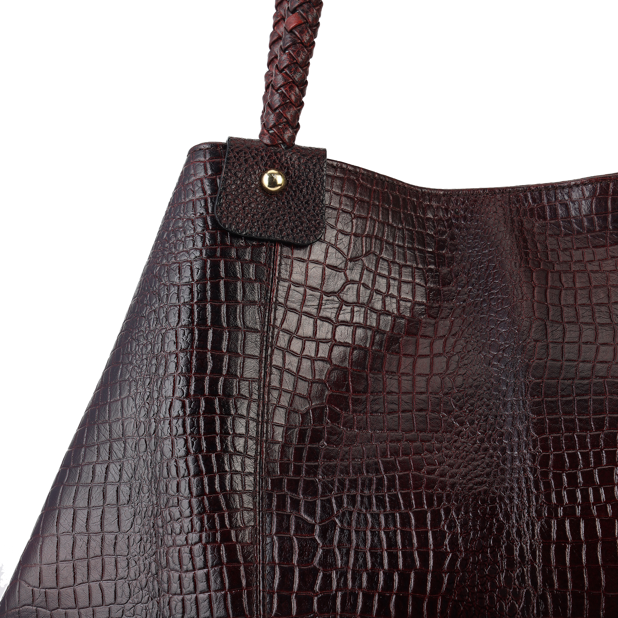 Elevate your daily style with this Classic Croc-Texture Tote Bag in rich deep brown. Made for women who love luxury with functionality, this statement tote features a glossy croc-embossed texture, soft structured silhouette, and beautifully braided handles for added elegance.