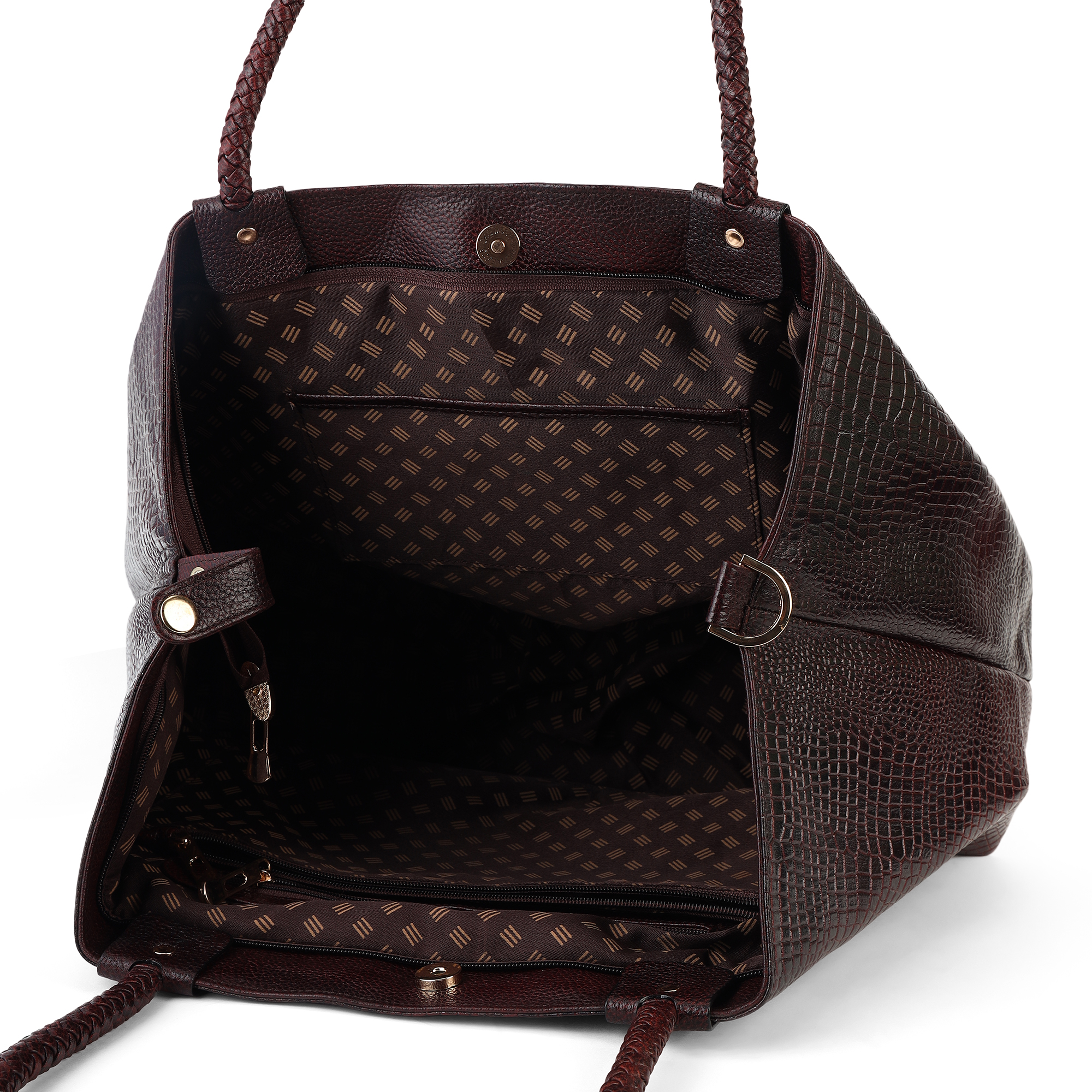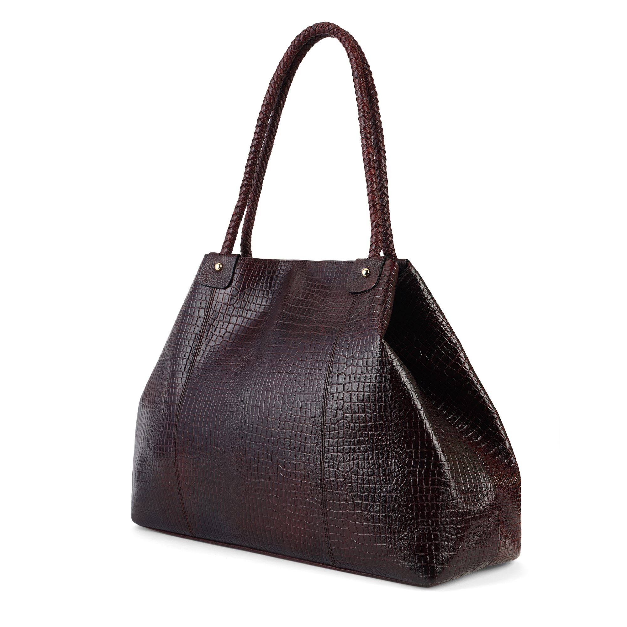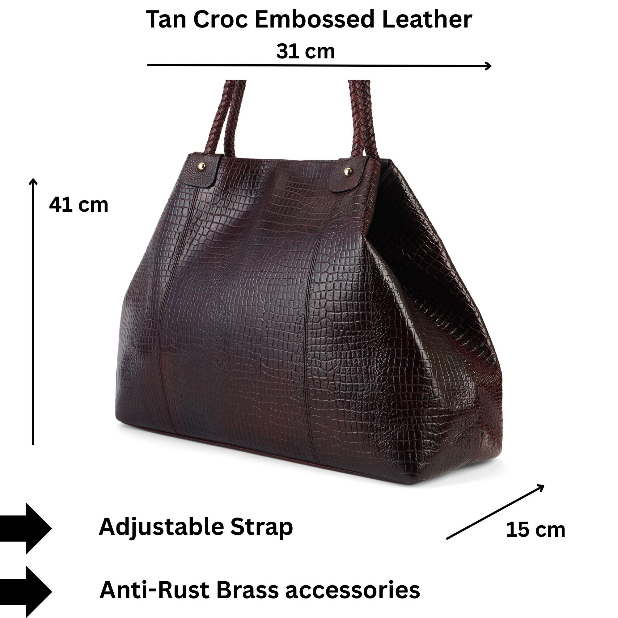 A spacious, croc-embossed tote bag crafted in deep brown vegan leather. Designed with braided handles, a soft structured shape, and a premium glossy finish—perfect for work, travel, and everyday ease.