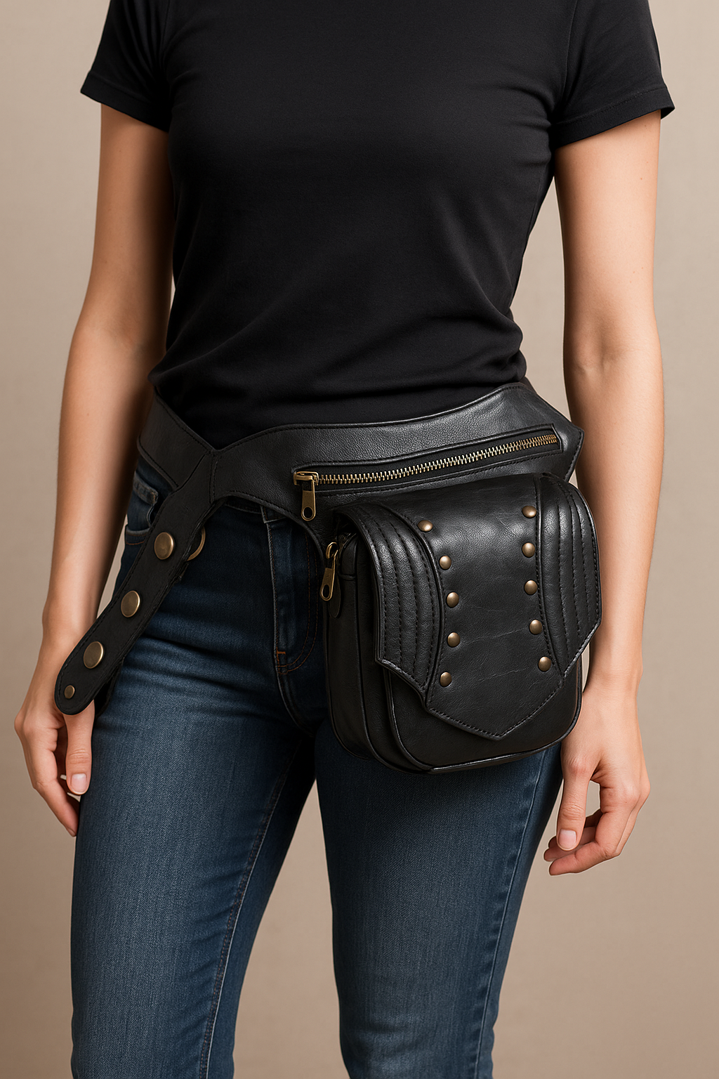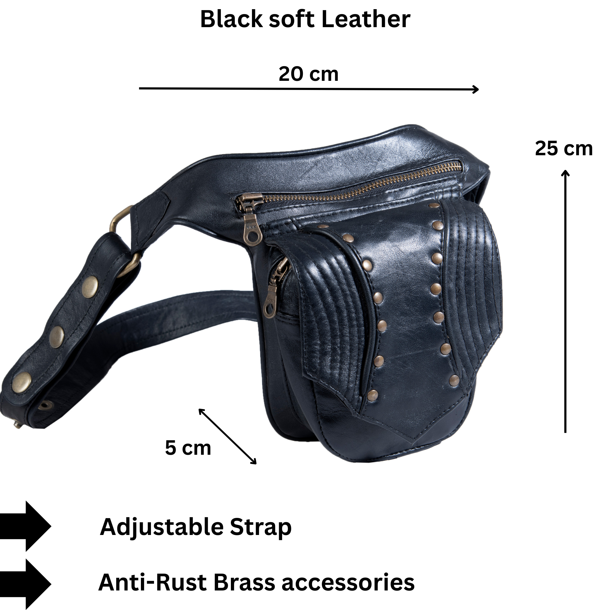 Black Leather Waist Pouch with Antique Brass Rivets – Hands-Free Everyday Utility