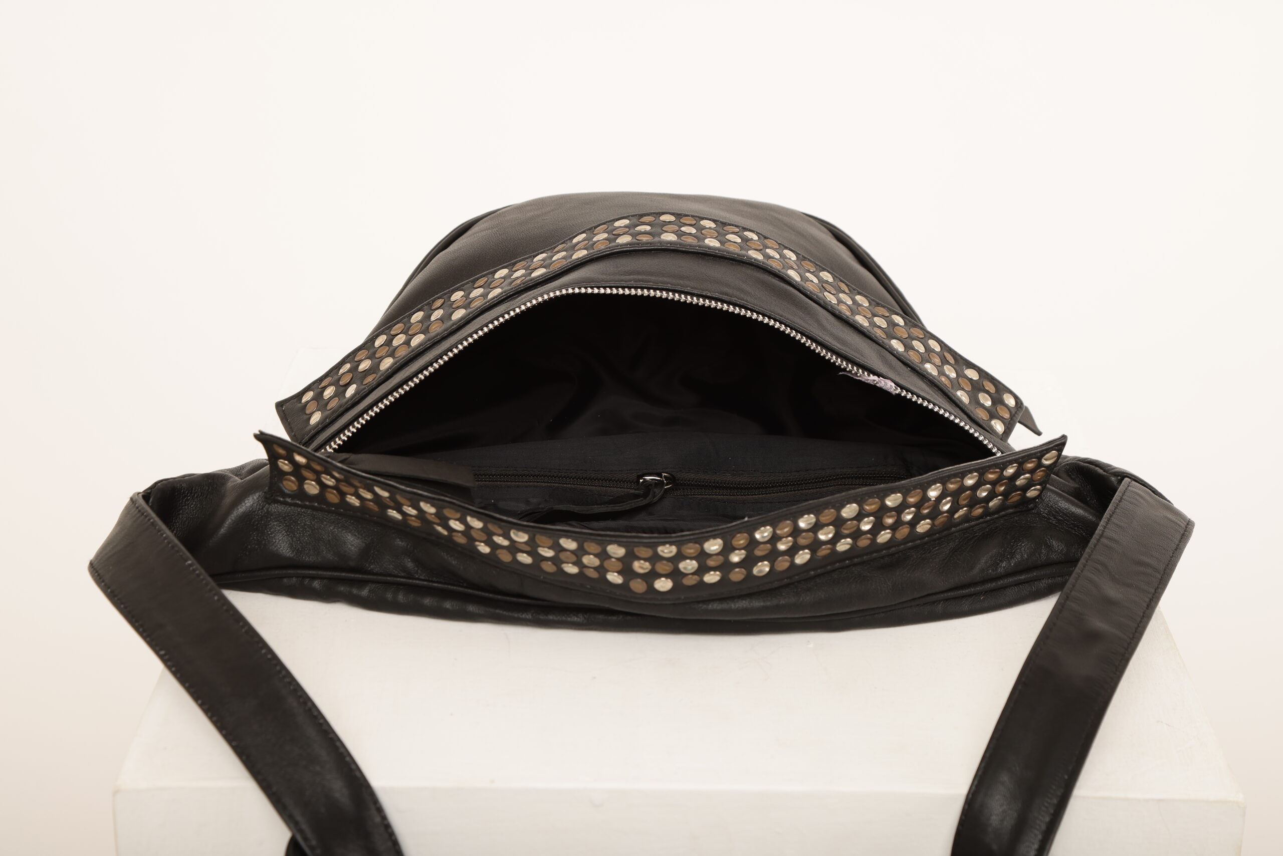 Introducing the Dario Dual-Studded Leather Waist Pouch, a statement accessory that brings confidence to your everyday carry. Crafted in premium black full-grain leather, the pouch features two dramatic studded bands — a blend of vintage and rock-inspired design. It’s built for function and flair, whether you’re heading out for errands or festivals. Designed for the bold.