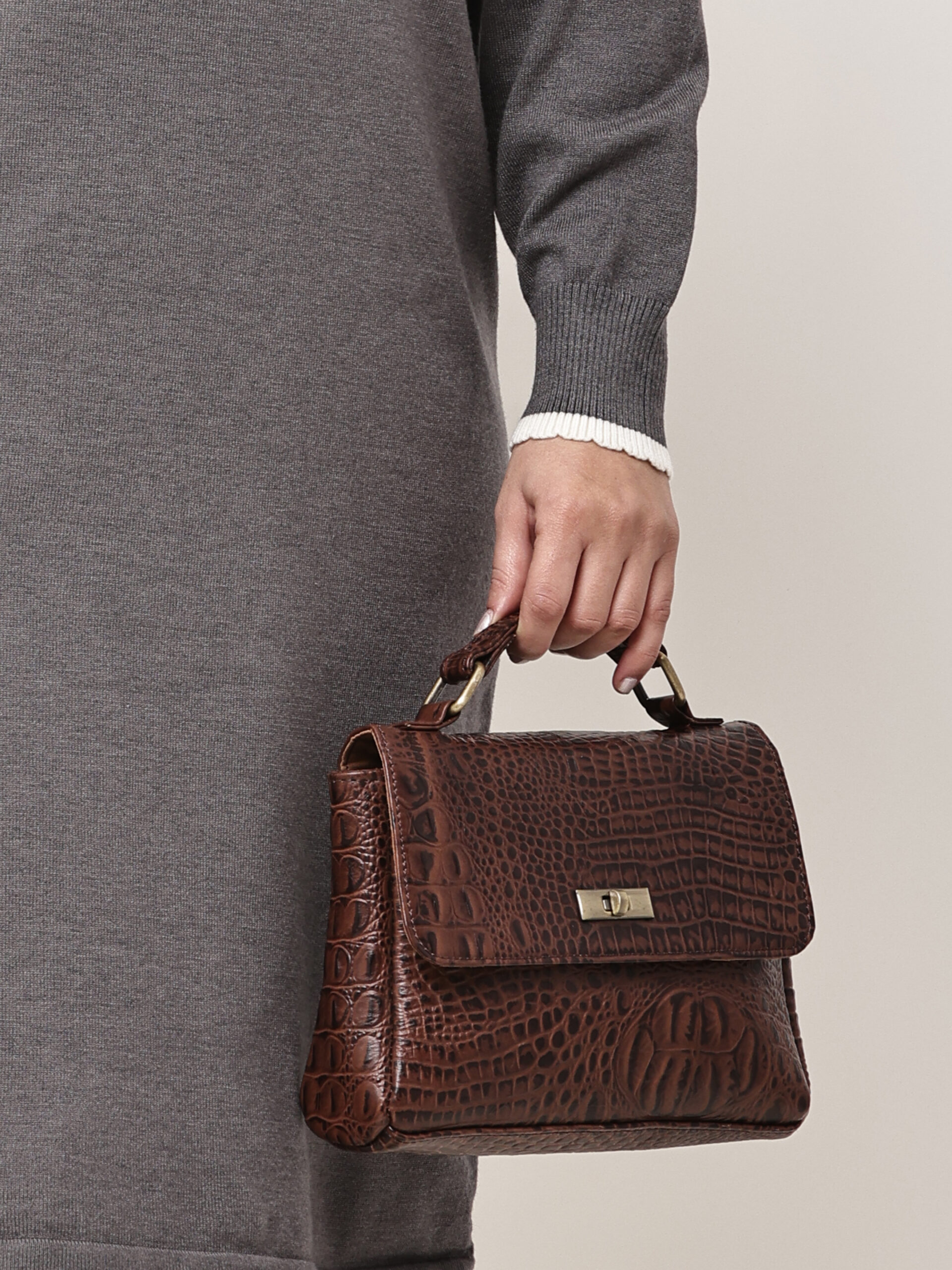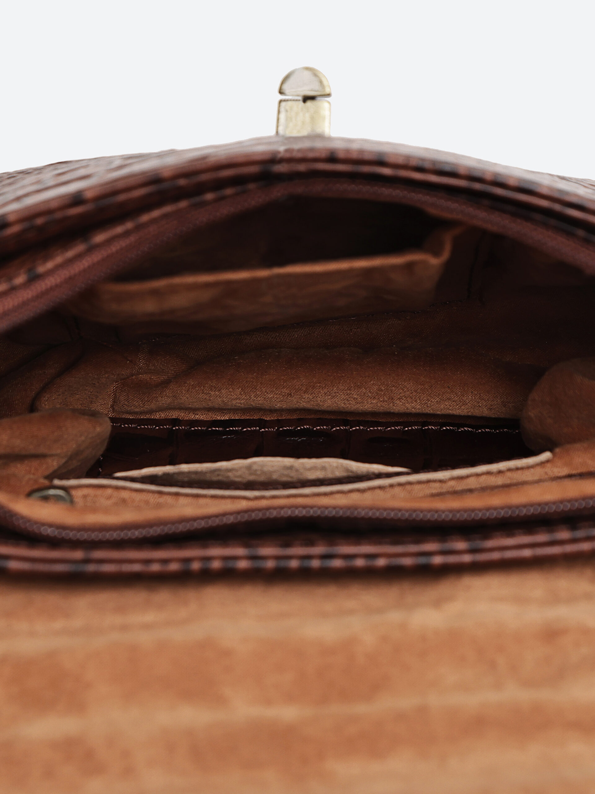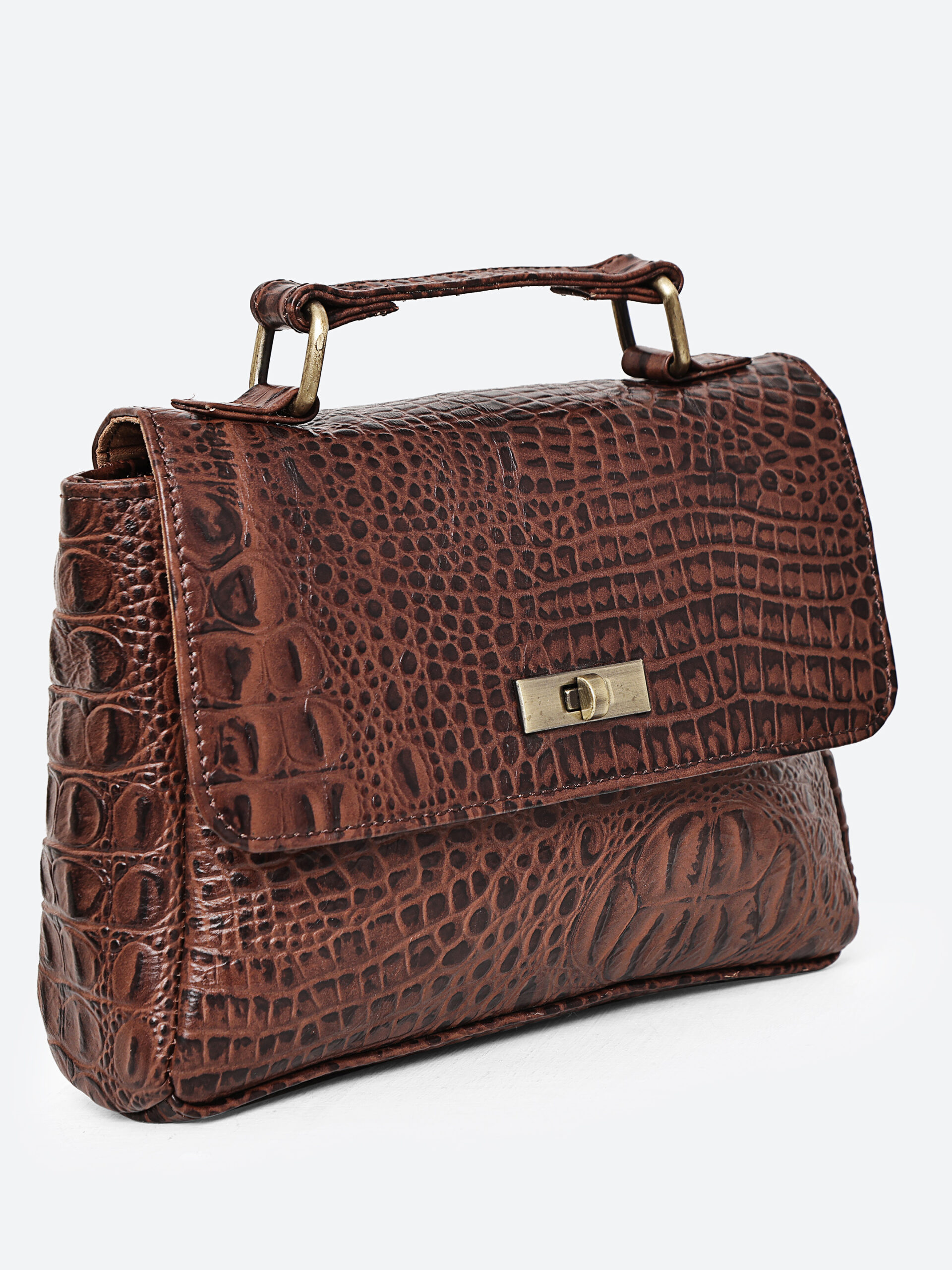 A compact, structured sling bag in rich croc‑embossed brown leather, with a top handle and an adjustable crossbody strap. Timeless, elegant, and perfect for daily use or evenings out.